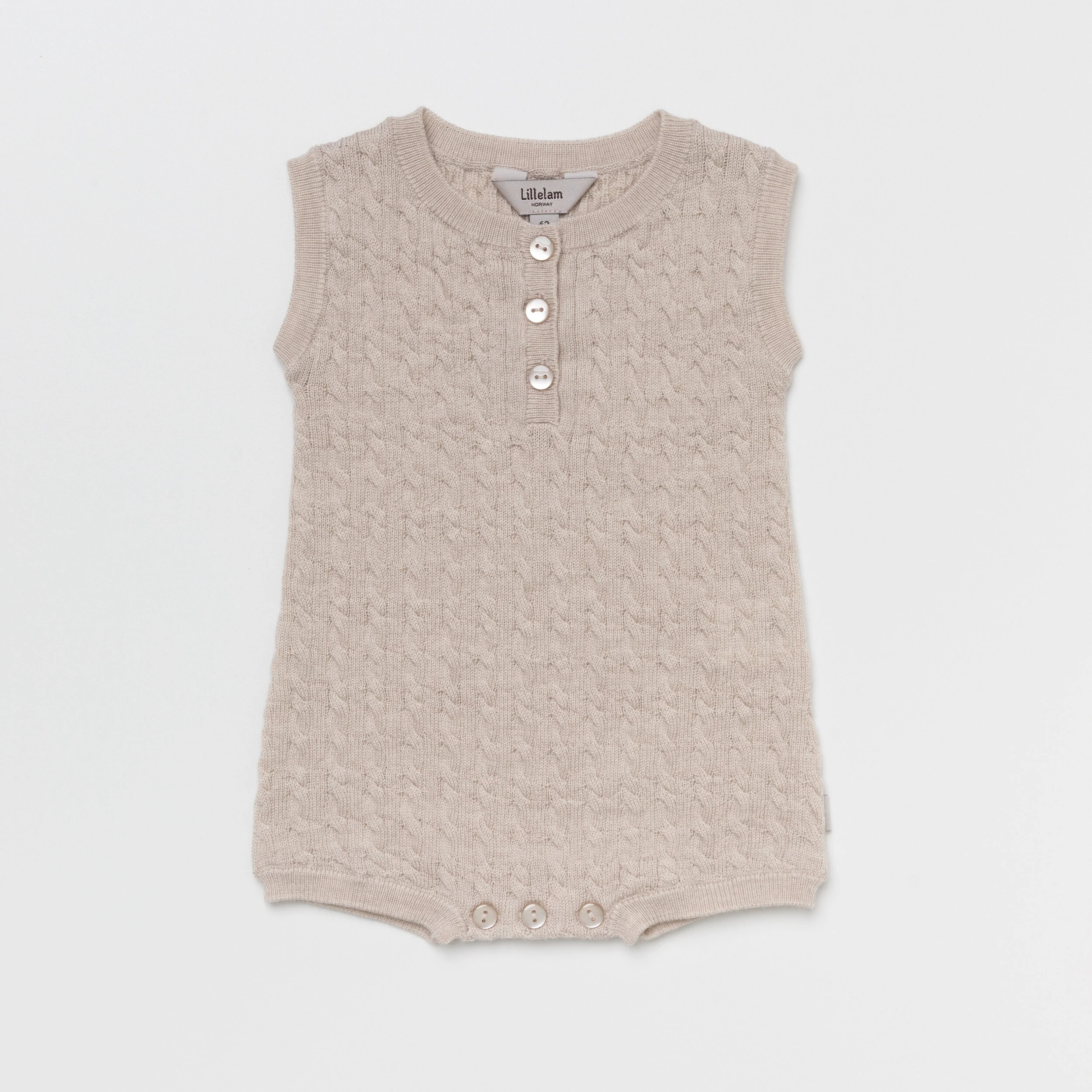 Denne strikkede romper i flettestrikk er et klassisk plagg med en søt fasong. Romper er strikket i vår tynneste kvalitet og har knapper i halsen og i skrittet.